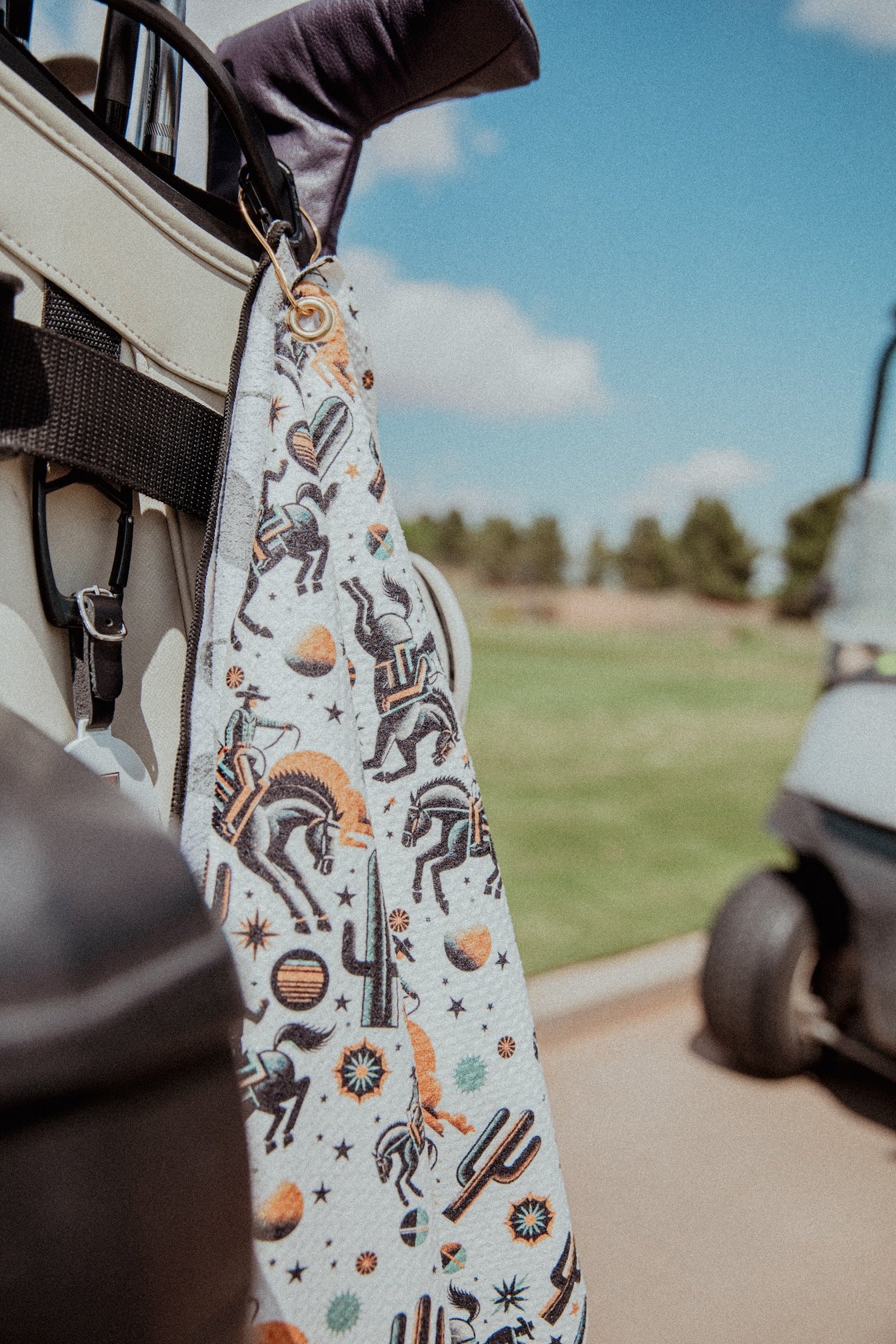 Introducing our signature Golf Towel—a fusion of rugged Southwestern spirit and refined performance. Featuring vibrant designs inspired by desert landscapes, vintage Americana motifs, and a touch of outlaw mystique, this towel delivers exceptional durability and absorbency to keep your gear clean and dry. Whether you're teeing off at dawn or perfecting your swing at sunset, elevate your game with a towel that blends style, grit, and functionality. Make a statement on the course and beyond.